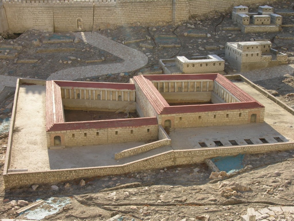 En el primer caso, se trata de una piscina con cinco arcadas que rodean una gran piscina de unos 100 metros de largo y de 62 a 80 metros de ancho, rodeada de arcos por los cuatro costados, lo que permite dar un aspecto verosímil al episodio del paralítico (Juan 5, 1-18) que tiene lugar en la “piscina probatica”.